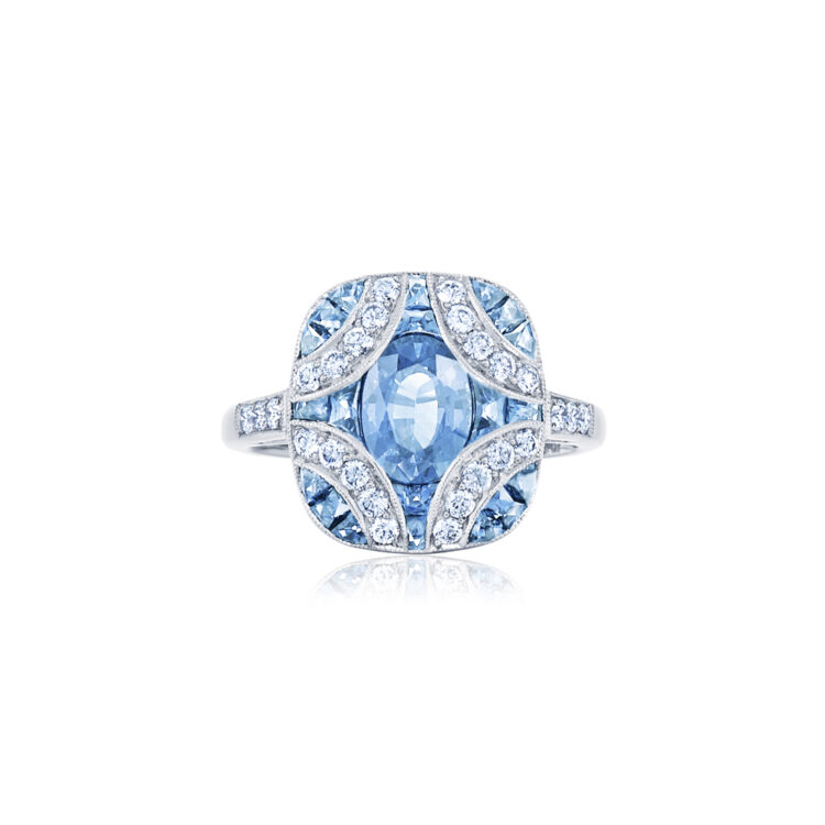 A graceful, geometric motif of color and light captures early 20th century style in an elegant 18K white gold ring set with aquamarines and diamonds. Kwiat artisans meticulously handcraft this design for the utmost beauty and brilliance.