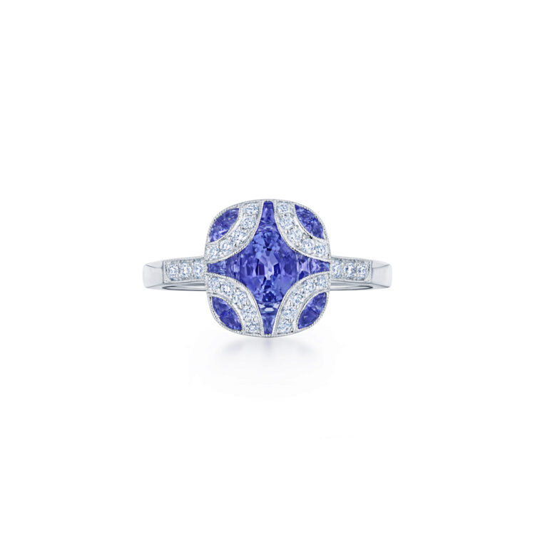 A graceful, geometric motif of color and light captures early 20th century style in an elegant 18K white gold ring set with tanzanites and diamonds. Kwiat artisans handcraft this design with exquisite gemstones and meticulous care for the utmost beauty and brilliance.