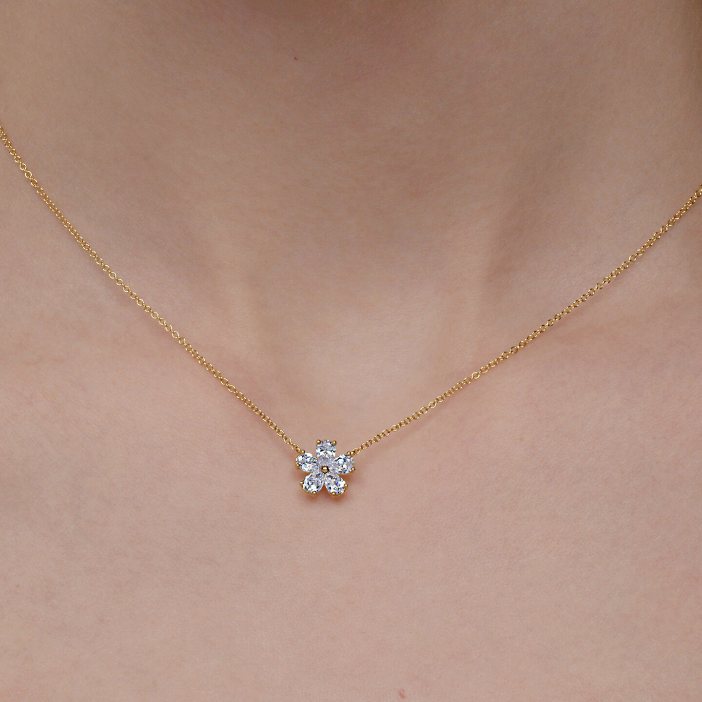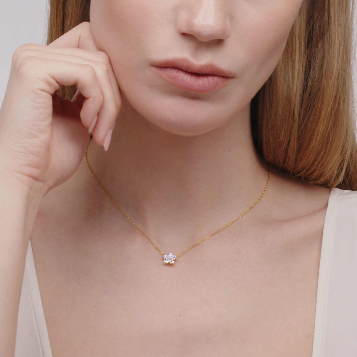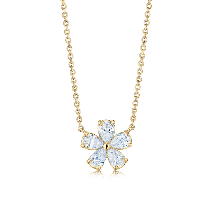 A flower that never fades. Exceptional diamonds cut to the highest standards bloom in a graceful pendant that brings sparkle to everyday looks and evening style. Kwiat artisans engineer the 18K yellow gold design to lay flat without twisting or flipping over, using minimal metal to maximize light flow into each diamond.
