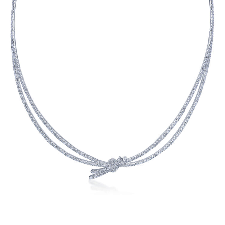 Our Entwine collection breathes new life into the knot, a classic jewelry motif. In this torque platinum necklace, a double strand of diamonds circles the neck, knotted in the center. To create this collection, Kwiat designers started with textile cord, looping and tying it to study how the shapes might come to life. The result is a trompe l’oeil effect expressed in precious metal and stones with the soft look of rope.