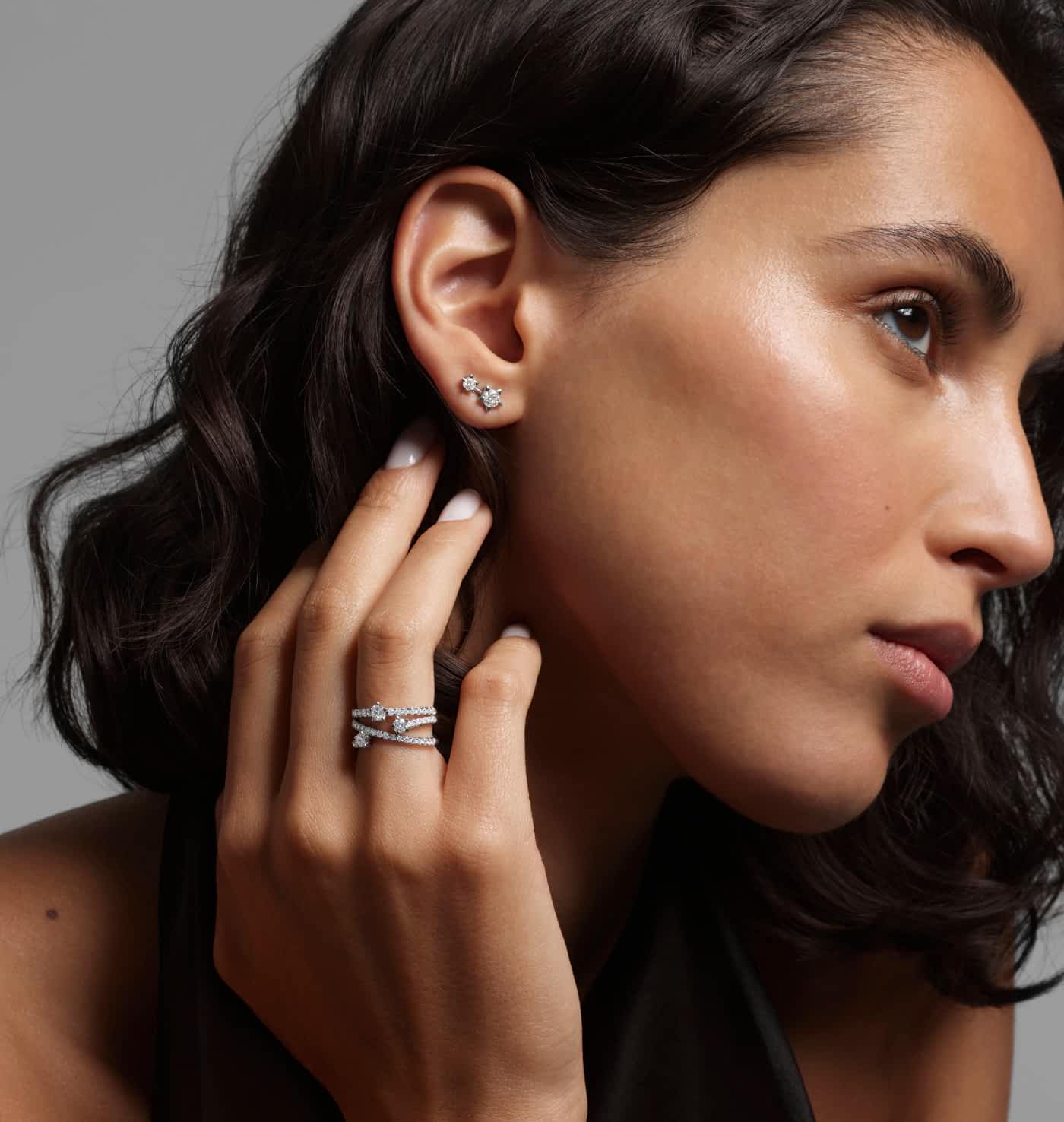 Diamonds appear to float like twinkling constellations in a dark sky.