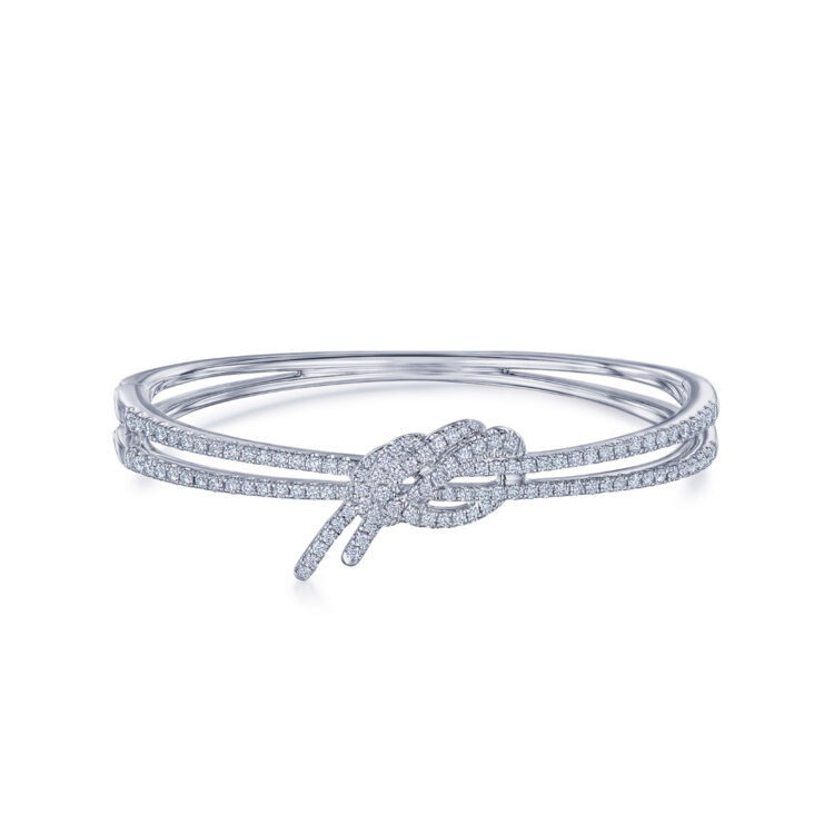 Two rows of pavé diamonds meet in a loosely tied loop that is a familiar yet surprising take on the knot in this 18K yellow gold bracelet.