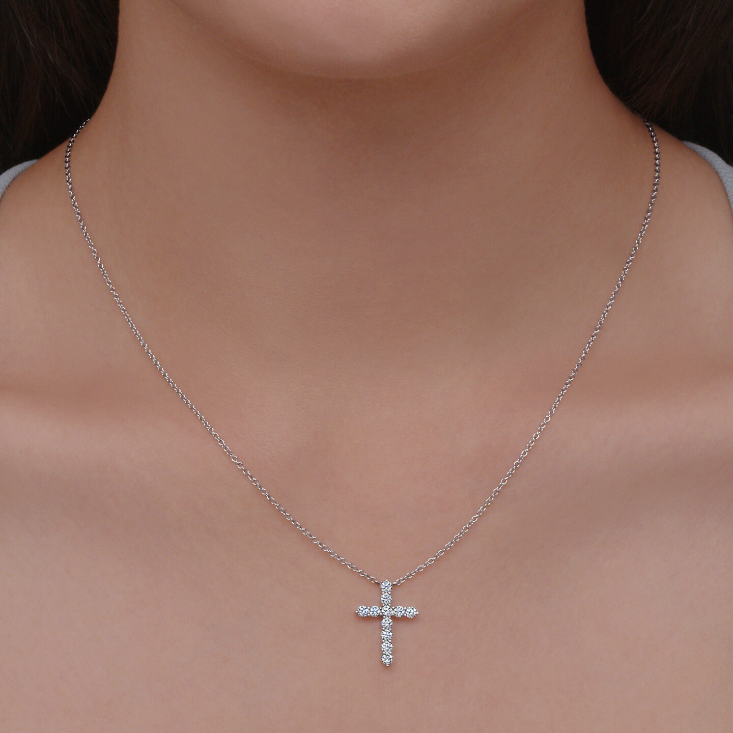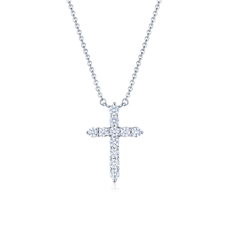 Round diamond cross pendant in 18K white gold with a total diamond weight of 0.50 carats