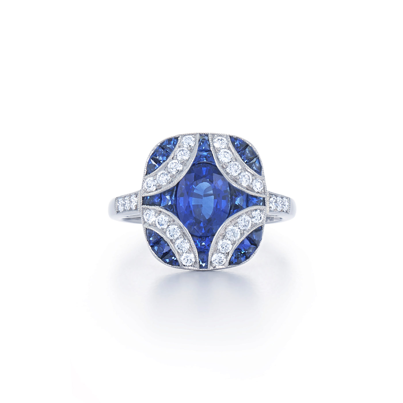 A graceful, geometric motif of color and light captures early 20th century style in an elegant ring set with calibre cut sapphires and round brilliant diamonds. Kwiat artisans handcraft this design in 18k white gold that has been slightly darkened to achieve the patina that heirloom jewels acquire through years of loving wear.