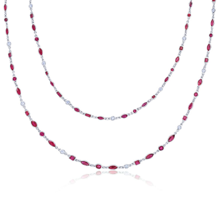 This fluid length of rubies and diamonds lends effortless elegance to day or evening looks, worn layered or solo. Mixed shape rubies and round diamonds are artfully alternated and set in platinum bezels along a glittering strand.
