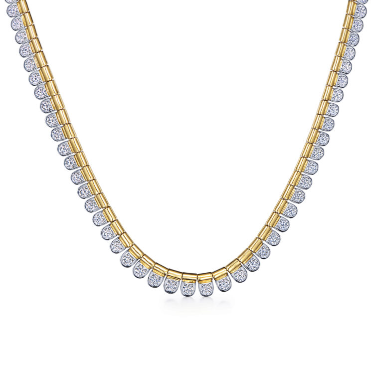 Sirena means “mermaid” in Spanish, Italian, and other Romance languages. The elegant scales of a mermaid’s tail inspire a necklace of 18K white gold scallops set with diamonds, edged in 18K yellow gold. Sleek and modern, yet absolutely timeless.