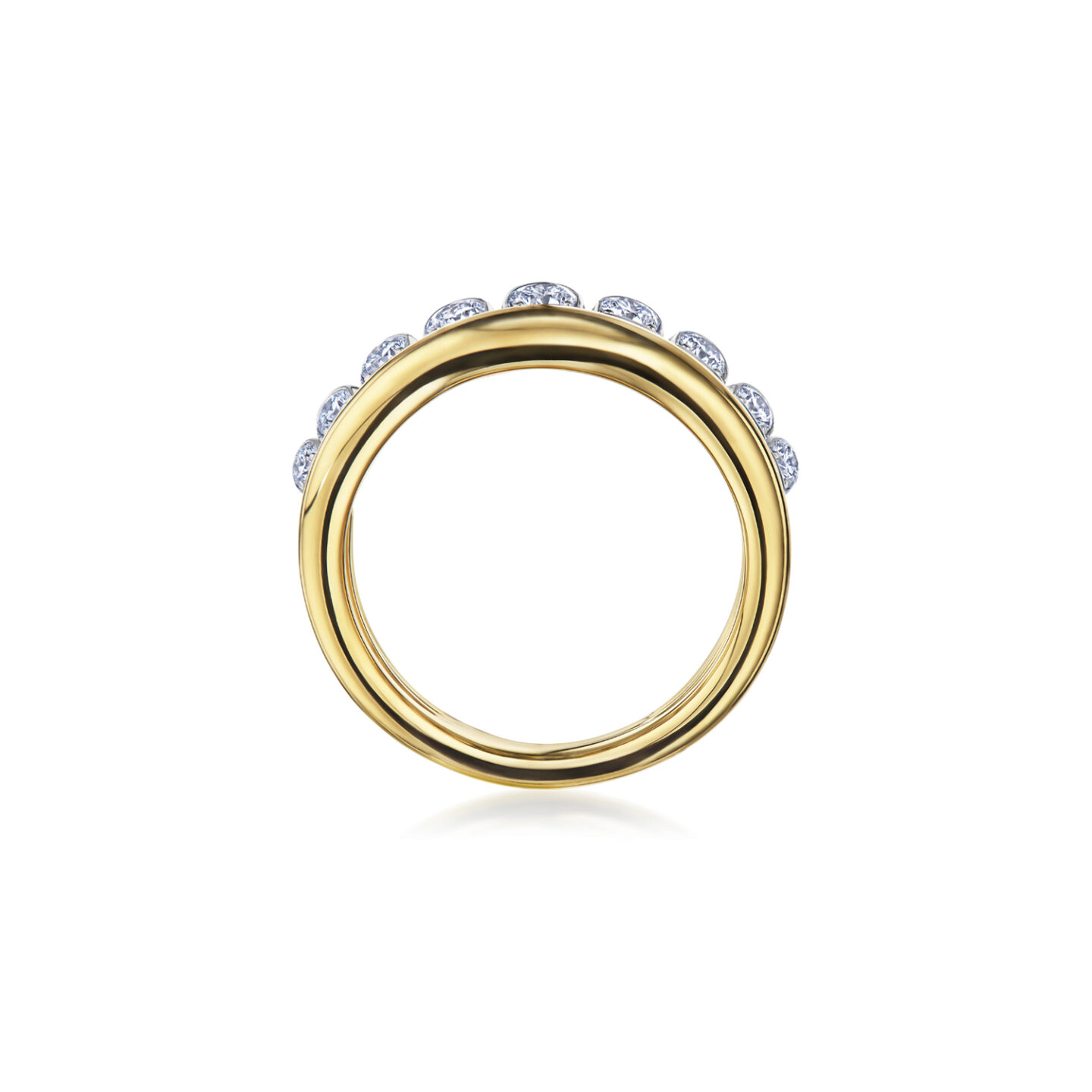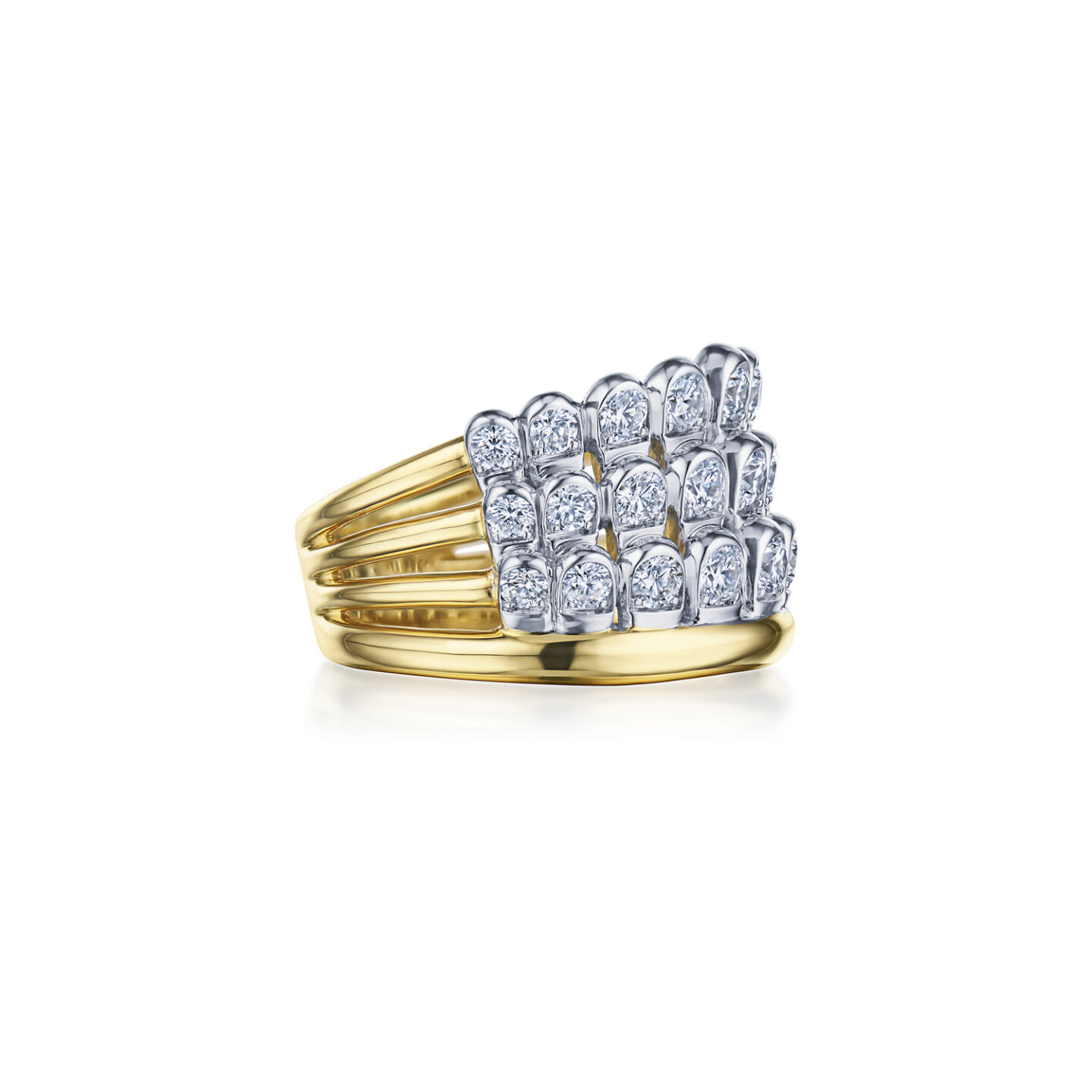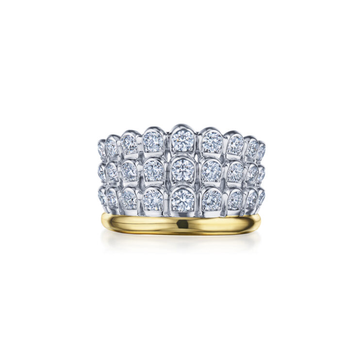 Sirena means “mermaid” in Spanish, Italian, and other Romance languages. The elegant scales of a mermaid’s tail inspire rhythmic rows of diamonds set in 18K white gold scallops, with a band of polished 18K yellow gold for contrast. This ring makes a bold statement that sparkles with every gesture.