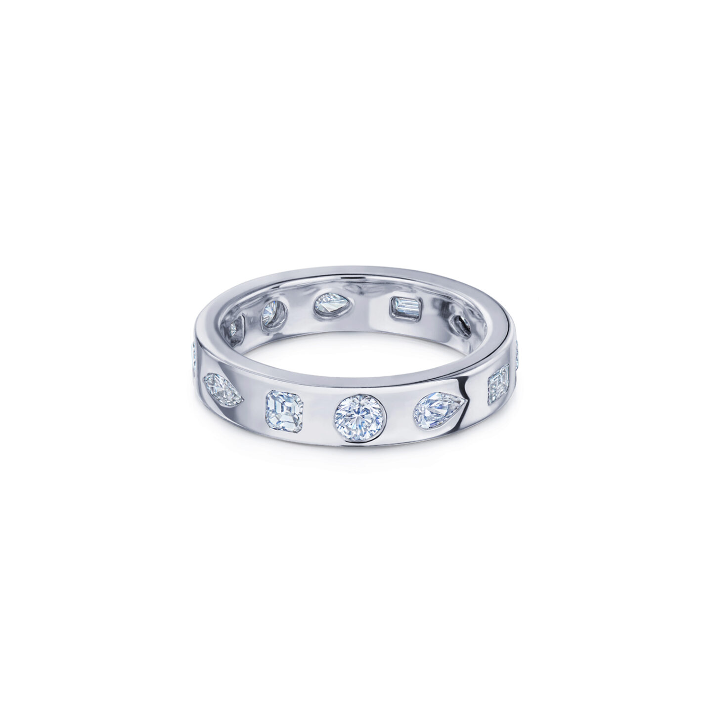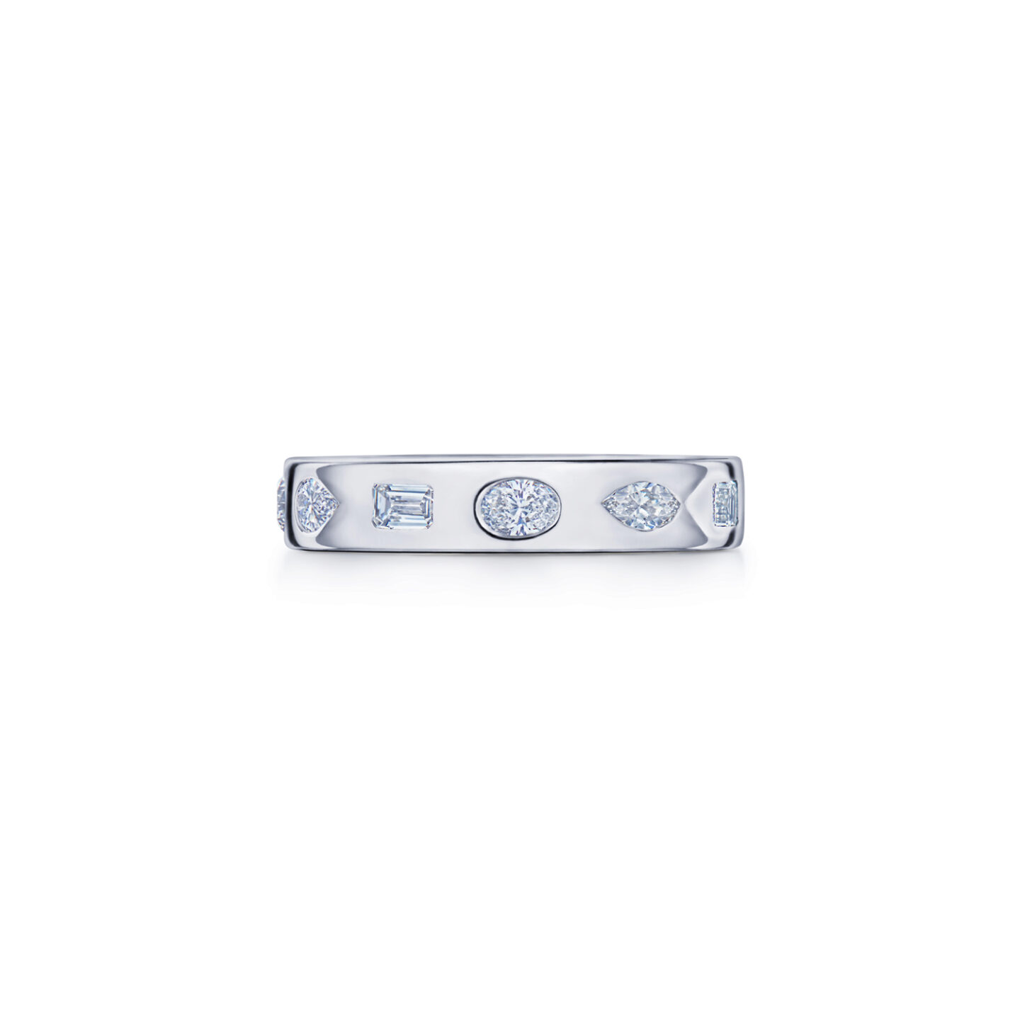 This smooth, modern design celebrates the beauty of fancy shape diamonds. Wear it as a wedding band or stack it with other favorite rings to express your style. Like all Kwiat diamonds, each stone is cut to the highest standards for maximum brilliance. Then, they are burnish set in an 18K white gold 4.55mm band for a sleek effect.