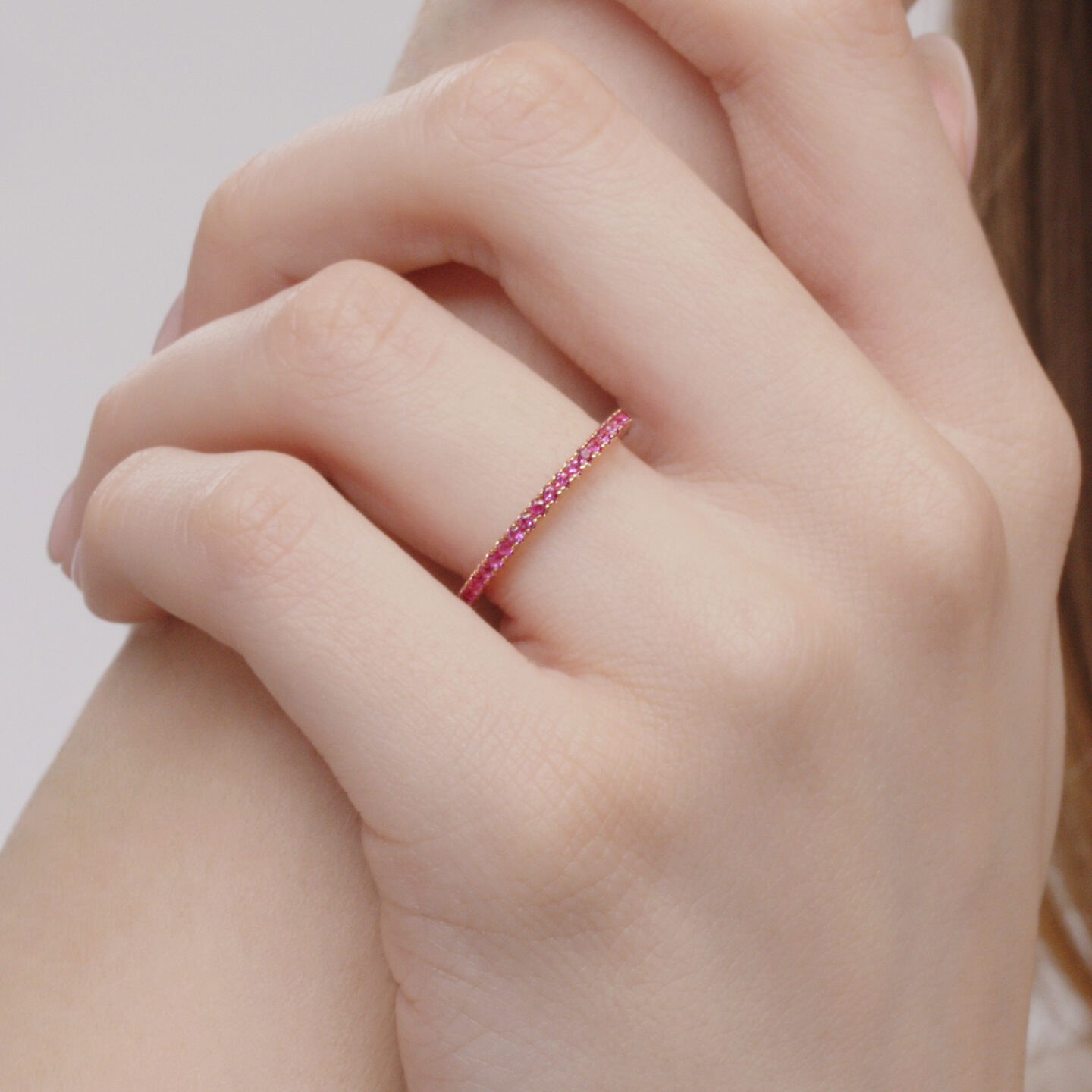 This slim, sparkling band makes a subtle statement on its own or adds a touch of color to your ring stack. Pink sapphires are meticulously set in 18K rose gold for a look that’s at once modern and timeless. Kwiat artisans carefully craft this 1.65mm wide ring to be comfortable and durable for everyday wear while maintaining a light, delicate effect.