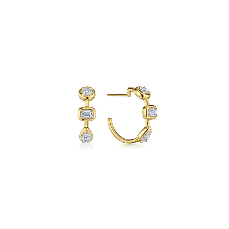 A modern trio of perfectly cut diamonds — round, emerald cut, and pear — shine around this Starry Night hoop. In 18K yellow gold bezel settings, these are earrings that exude everyday brilliance.