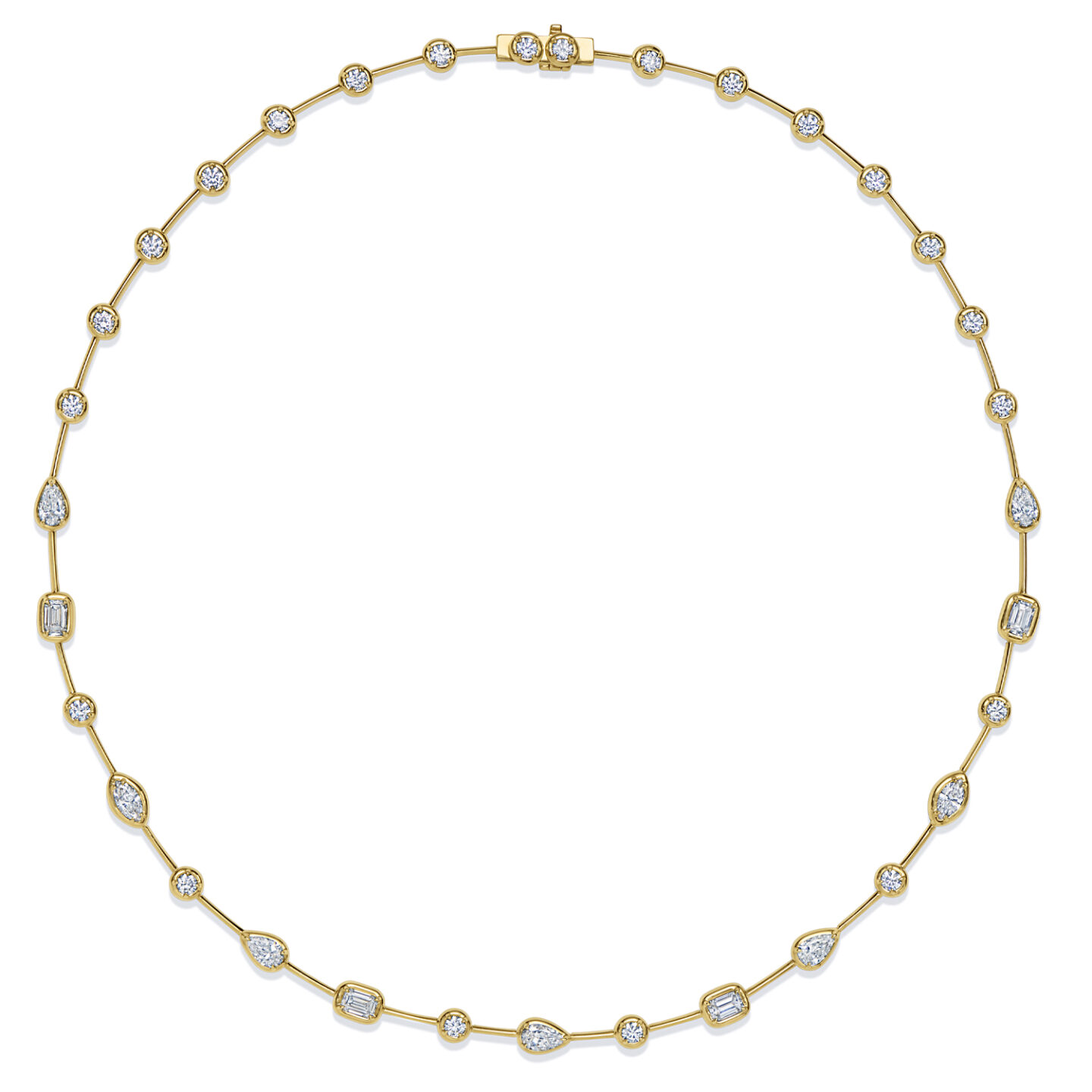 Mixed shape diamonds are bezel set for bold brilliance in this Starry Night collection. Marquise, round, pear and emerald cuts completely encircle the neck to give you a warm 18K gold glow from day to night.