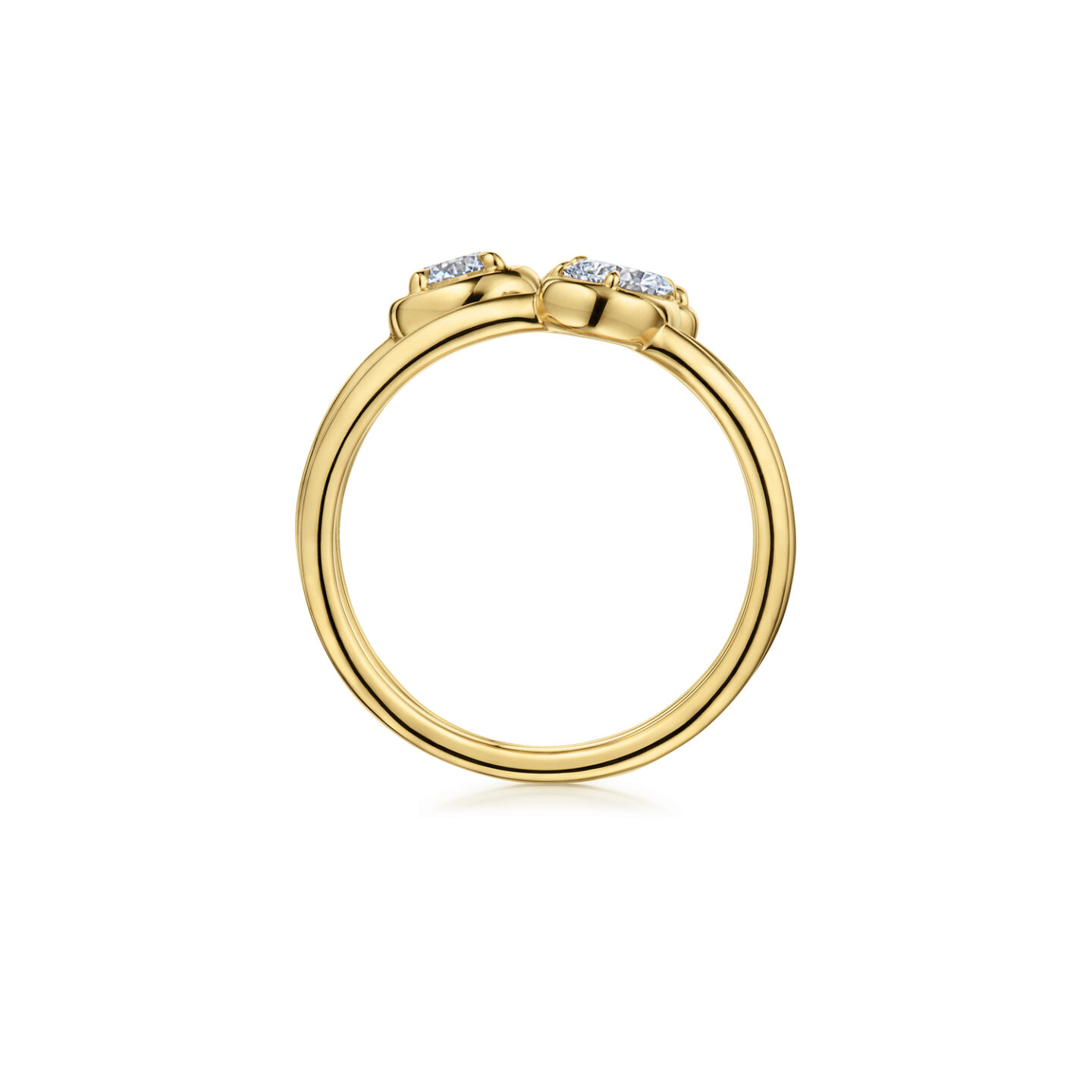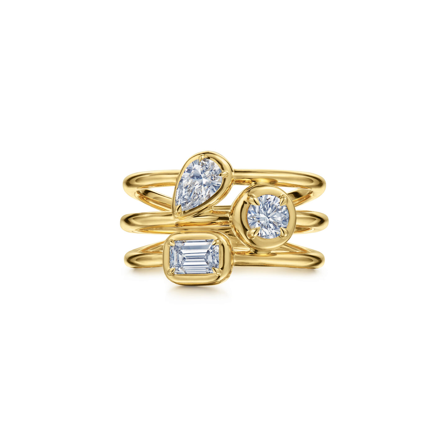 Pear, round, and emerald cut diamonds in bezel settings stack up to create this stunning ring. Three distinct rows of bright 18K yellow gold come together in perfect harmony, offering a bold look in a single piece.