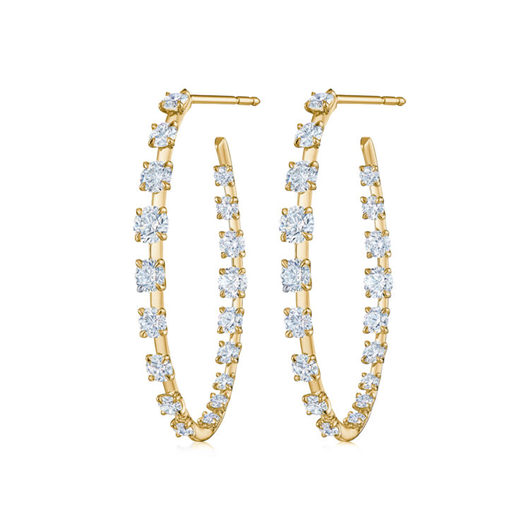 Diamonds float in airy designs like points of light in a midnight sky. These modern earrings celebrate the beauty of Kwiat round brilliant and marquise diamonds, each meticulously cut to the highest standards. Set on the inside and outside of a hoop of delicate 18K yellow gold, they frame the face with beauty and light.